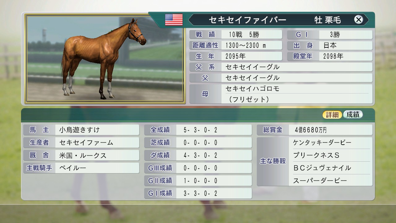 6歳時から3年連続で米国の年度代表馬になったセキセイゼロ。2冠馬で今年の最優秀3歳牡馬のセキセイファイバー。