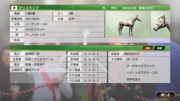 『ウイニングポスト9 2020』のプレイ日記です。凱旋門賞馬モンジューの母フロリペデスから愛1000ギニー馬アゲインの母クンブレと、名牝の血を引く史実馬アリスをピックアップしました。産駒も次々とデビューしています。